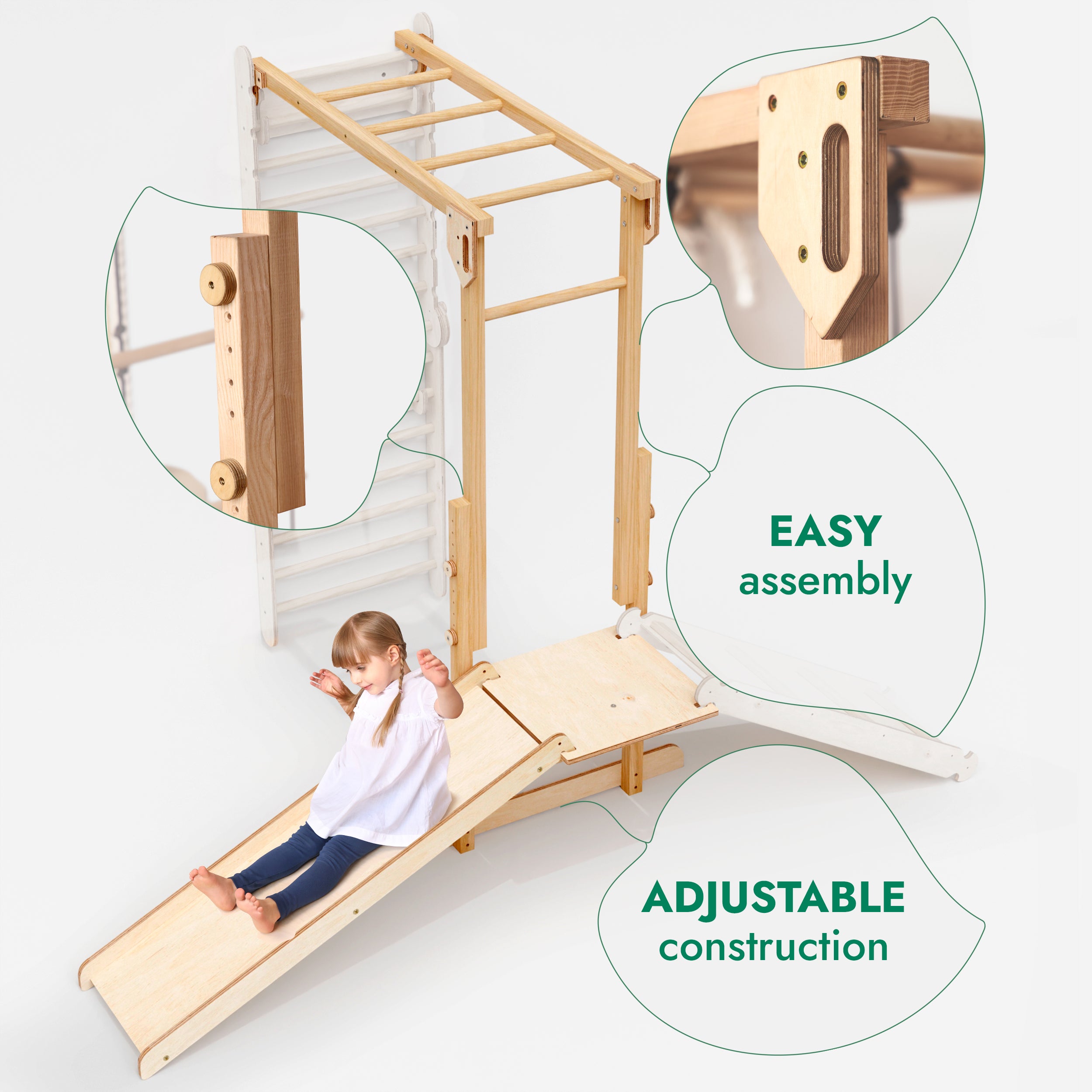 The perfect home solution is a play and sports complex combining a classic Swedish wall with a full-featured jungle Play Set. Folded, it functions as a standard Swedish wall with a rope set; unfolded, it becomes a complete sports corner with a pull-up bar and two slides (one is a versatile double-sided slide). Ideal for children from 2 years old, it helps develop strength, endurance, coordination, and imagination.