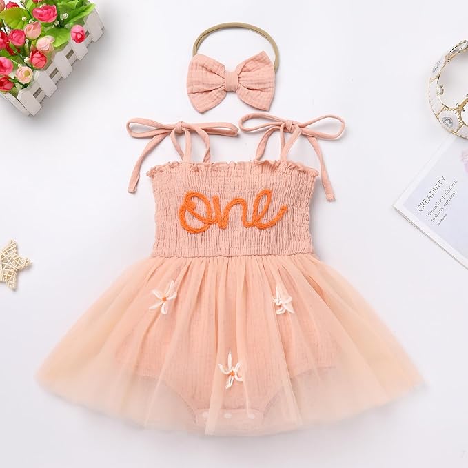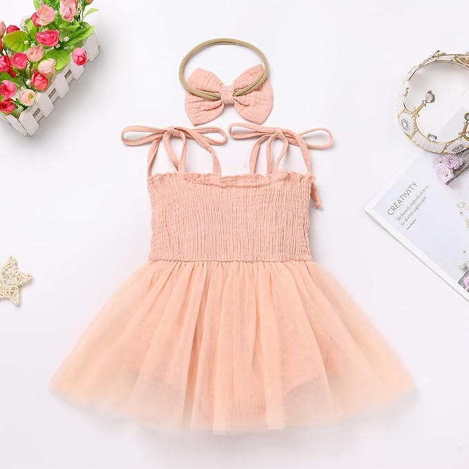 • Kids Girls Summer Casual Outfits Smocked Tutu Jumpsuit Romper Dress and Headband, 2pcs set. The summer adorable two-piece outfits spaghetti straps ruffle bodysuit romper dress and headband for girls, looks so sweet and lovely in the daily life. After wearing them, your sweetie will receive a lot of compliments on this.