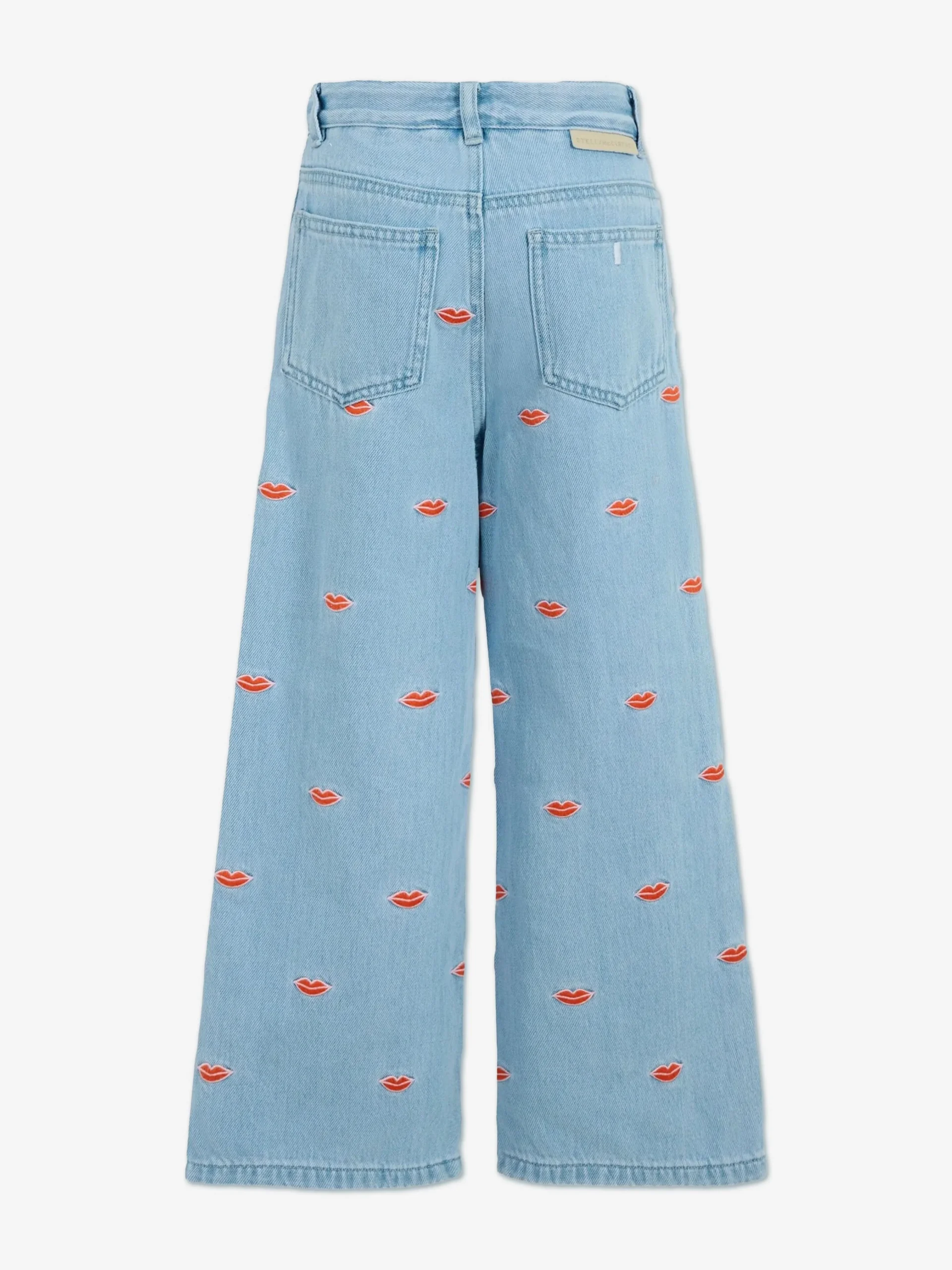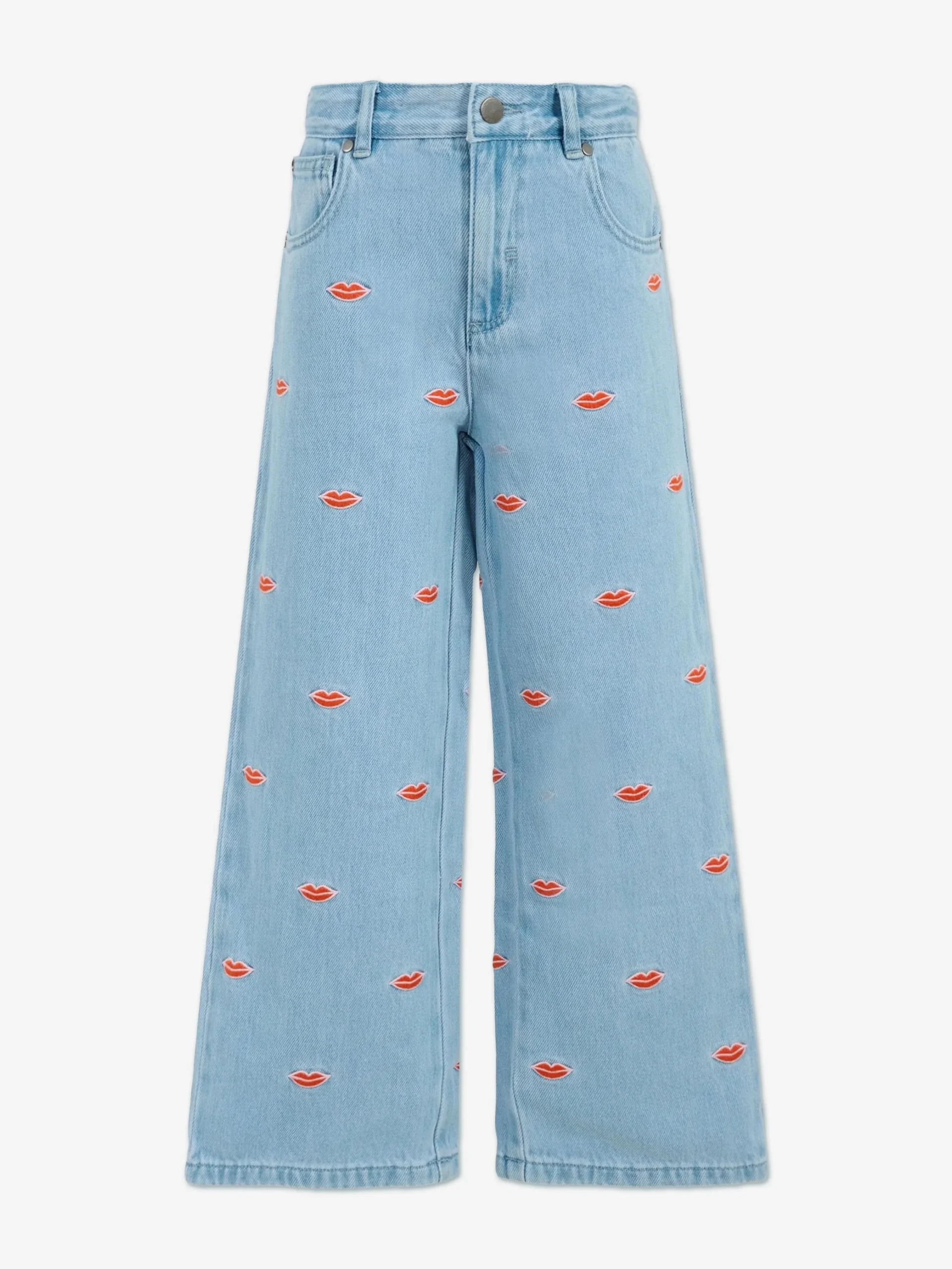 Girls Embroidered Lips Wide Leg Jeans in Blue
