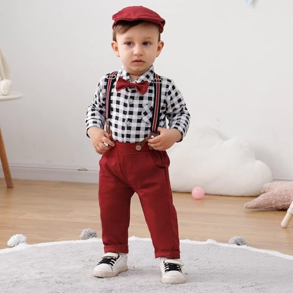 Baby Boy Gentleman Clothes Suit 0-18 Months Infant Formal Long Sleeve Tuxedo Romper Jumpsuit + Suspender Pants + Beret Hat 3pcs